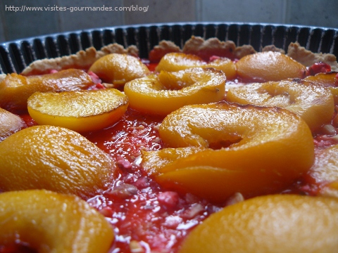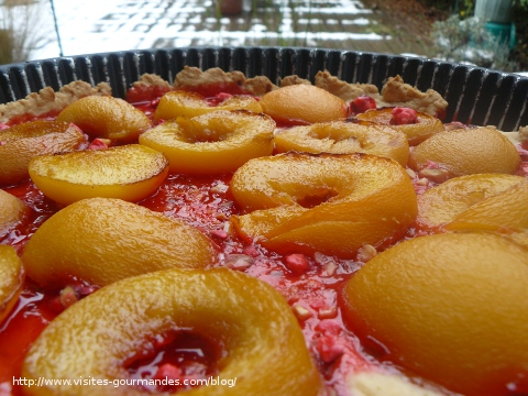 Une variante de la tarte aux pralines , un délice tout simplement avec des pêches fondantes , un peu de vanille, sur un fond rose presque caramélisé et le croquant des amandes.